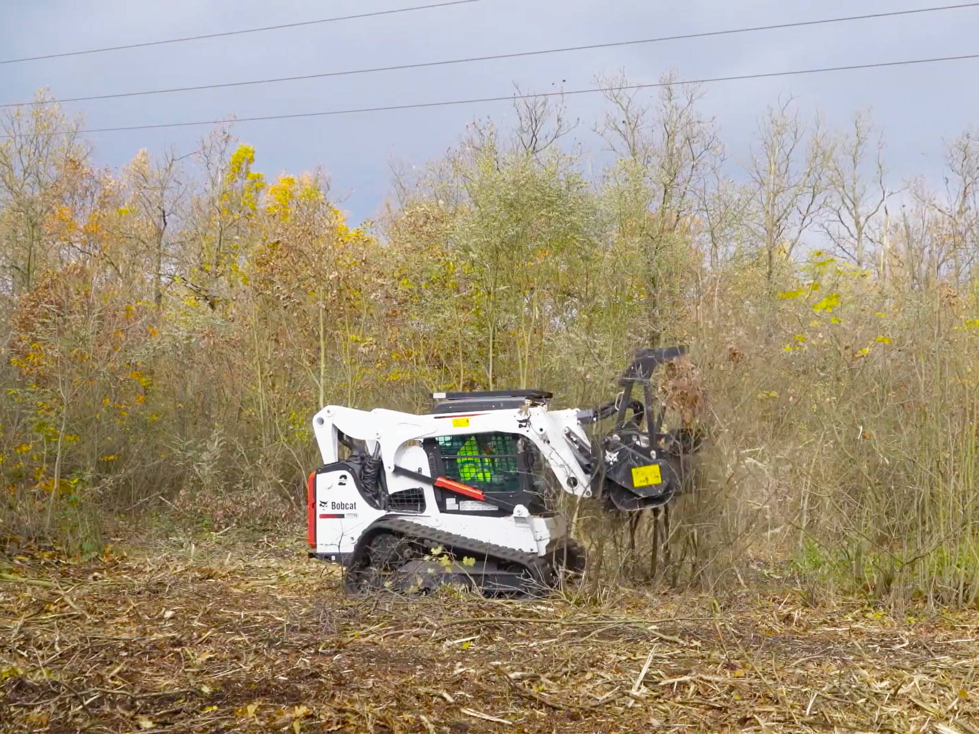 Med vår maskinells slyröjare förvandlar vi träd och snårskog från ful överväxt till täckmaterial på bara några minuter. Skogsröjaren lämnar kvar en matta av täckmaterial vid röjning av träd och buskar. Denna metod är lämplig vid röjning för riskbegränsning före eller efter naturkatastrofer, underhåll av trafikreservat, väggrenar, ledningsgator och runt skalskydd.